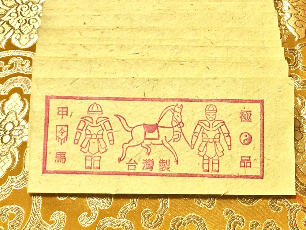 一般傳統甲馬都是圖案不清晰、兵將兵馬戰甲不夠完整性、因為在製作上為了控制紙張大小關係成本、所以都做的較薄印色兵器不清楚、極品看到了這種現象從新思考、設計、請教仙ㄟ做出一版符合現代使用的甲馬、把三國時期的『楚漢相爭,鴻溝為界』象棋概念帶入設計、一款真正純竹紙製作的甲馬、號角、兵器、酒葫蘆、戰甲、真正作戰所需的元素通通帶入、量不用多讓兵將都能滿意、都能喜歡、真正落實環保燒了不會亂飛。