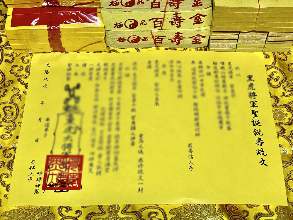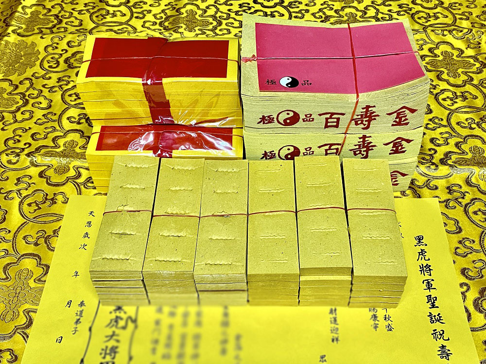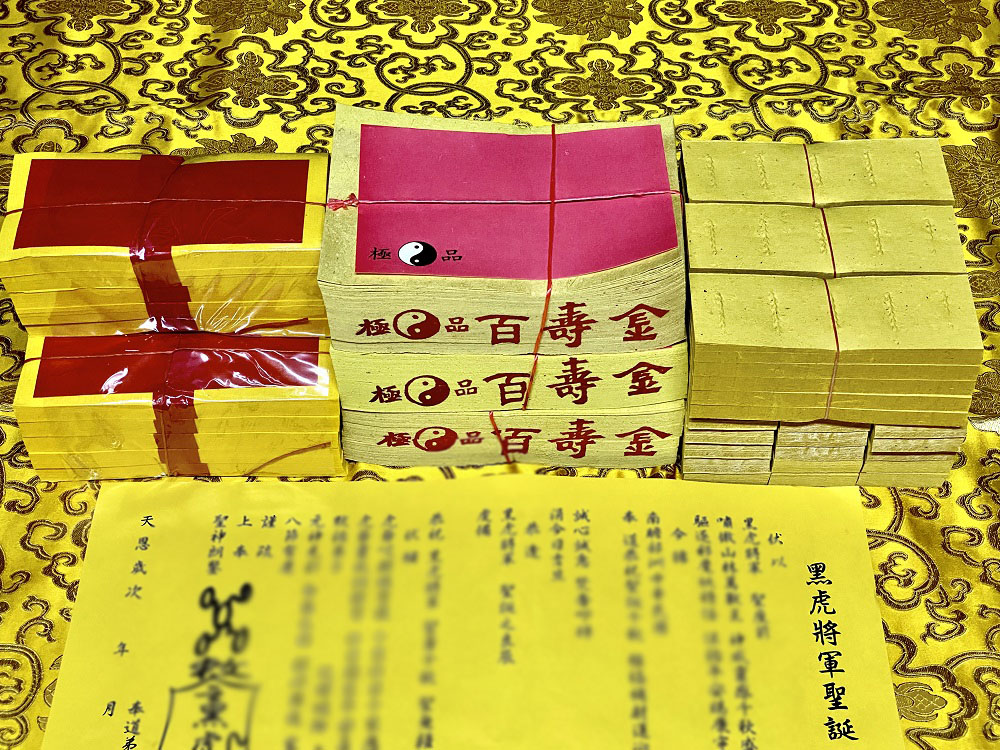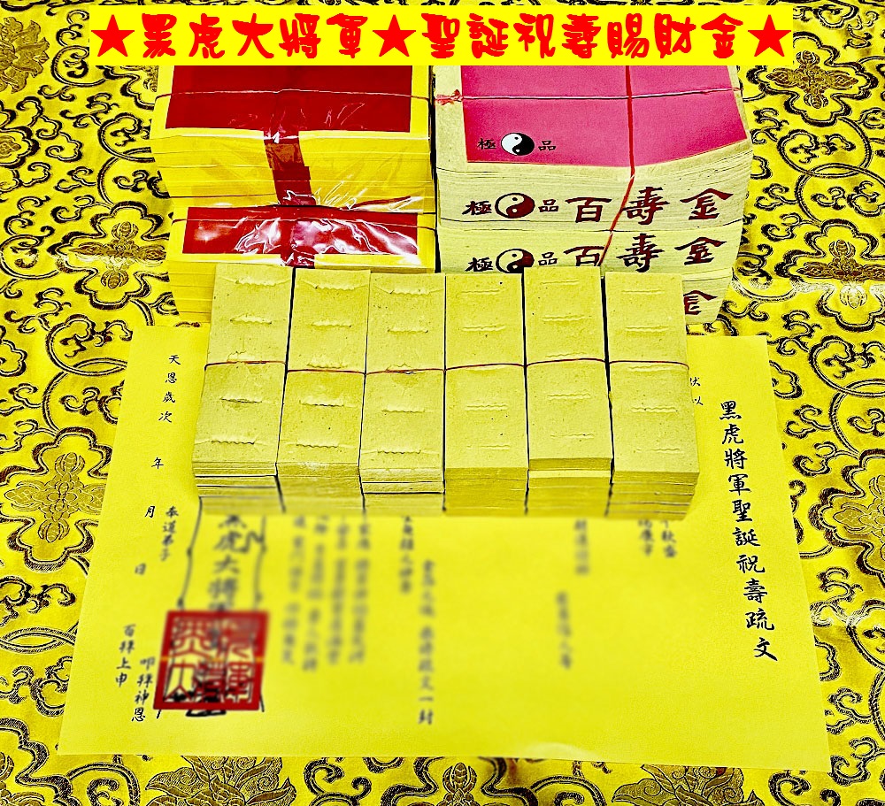 元寶山紙品~黑虎大將軍祝壽金紙、聖誕農曆6月初6日、壽金是答謝、古體斬錢孔虎爺錢是賜財、五爪金錢是零用錢(一份368元)